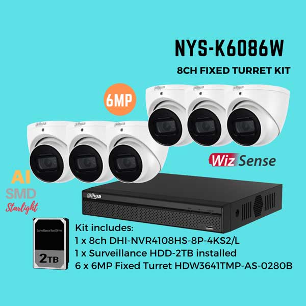 Experience seamless surveillance with the Dahua NYS 6MP 8ch Kit. This comprehensive package includes an 8-channel NVR and six high-resolution cameras with fixed lenses. Enjoy peace of mind knowing your property is under vigilant watch.